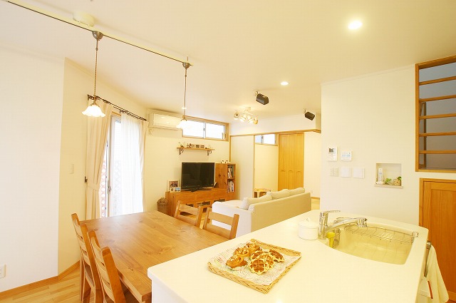アイランドキッチンが印象的なS様邸。キッチン脇にはスキップフロアスペースも。