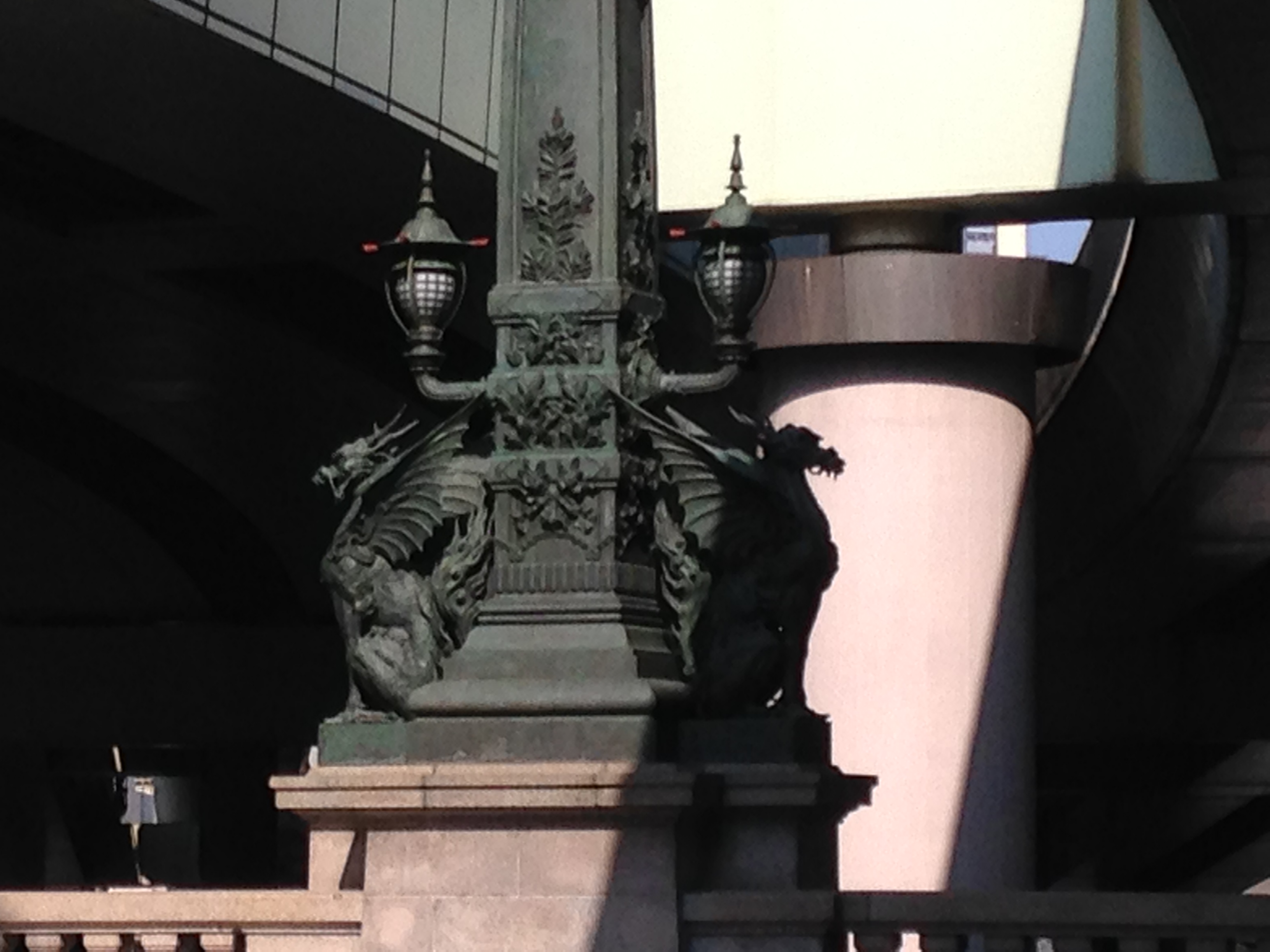 高島屋から三越に行く途中の日本橋の欄干の「キリンと獅子」と道路元票です。