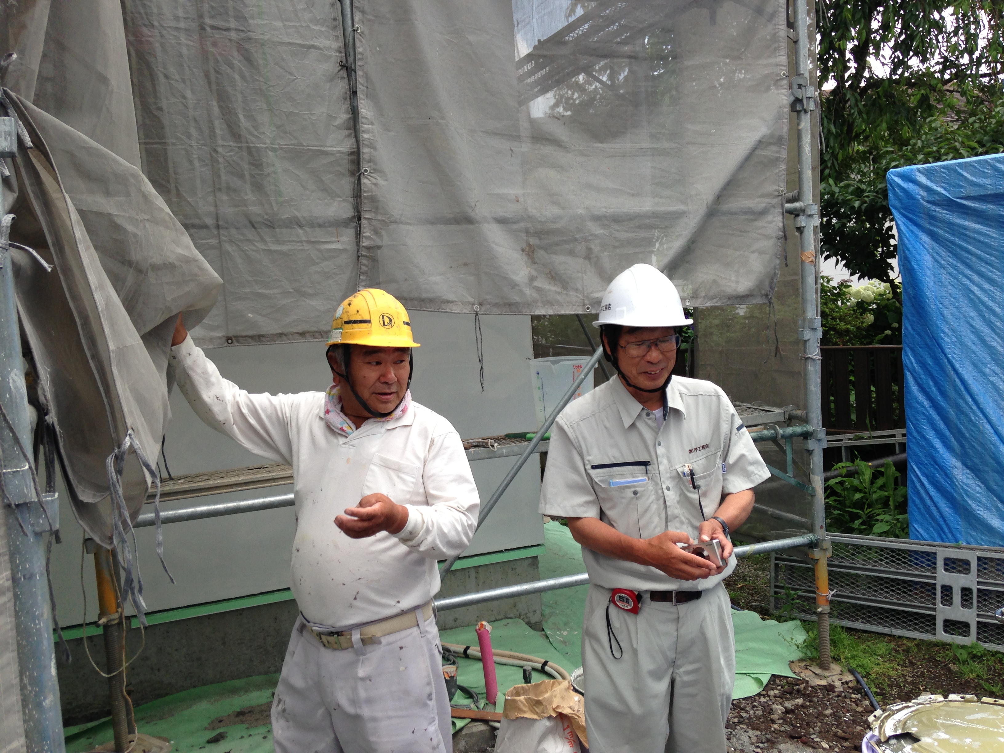 木工事完了検査中の池田監督とボード貼り作業中の松尾大工親方です。