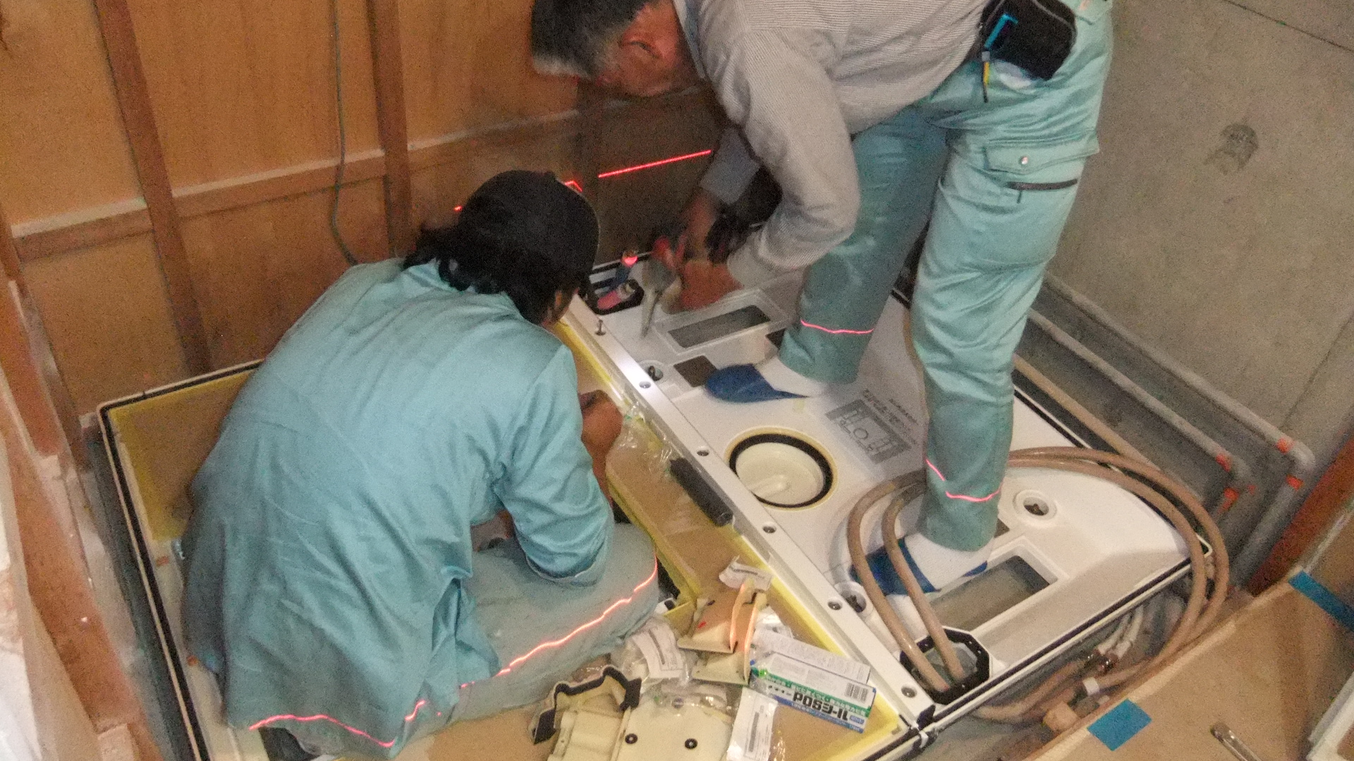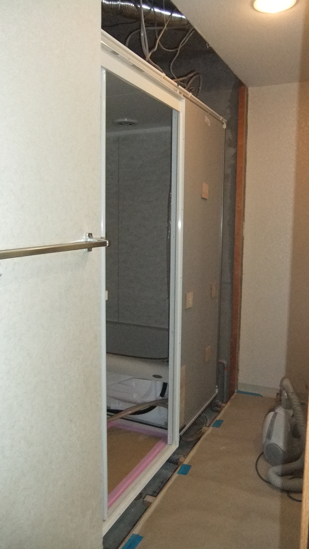 この後、白い床パンの上に浴槽を据えてから まわりの壁パネルを立てます。