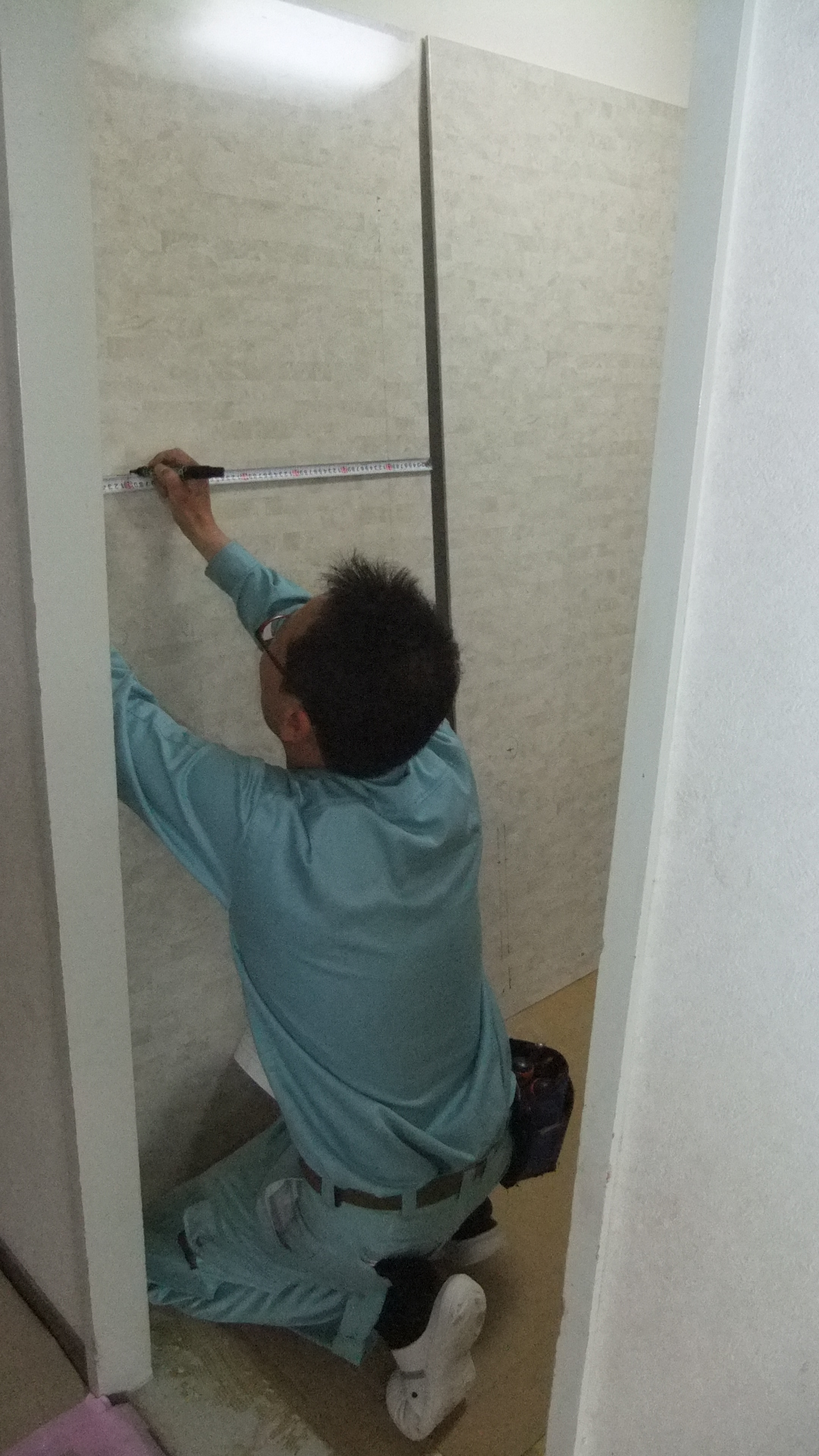 組み立て職人さんがタオル掛けの位置を測って