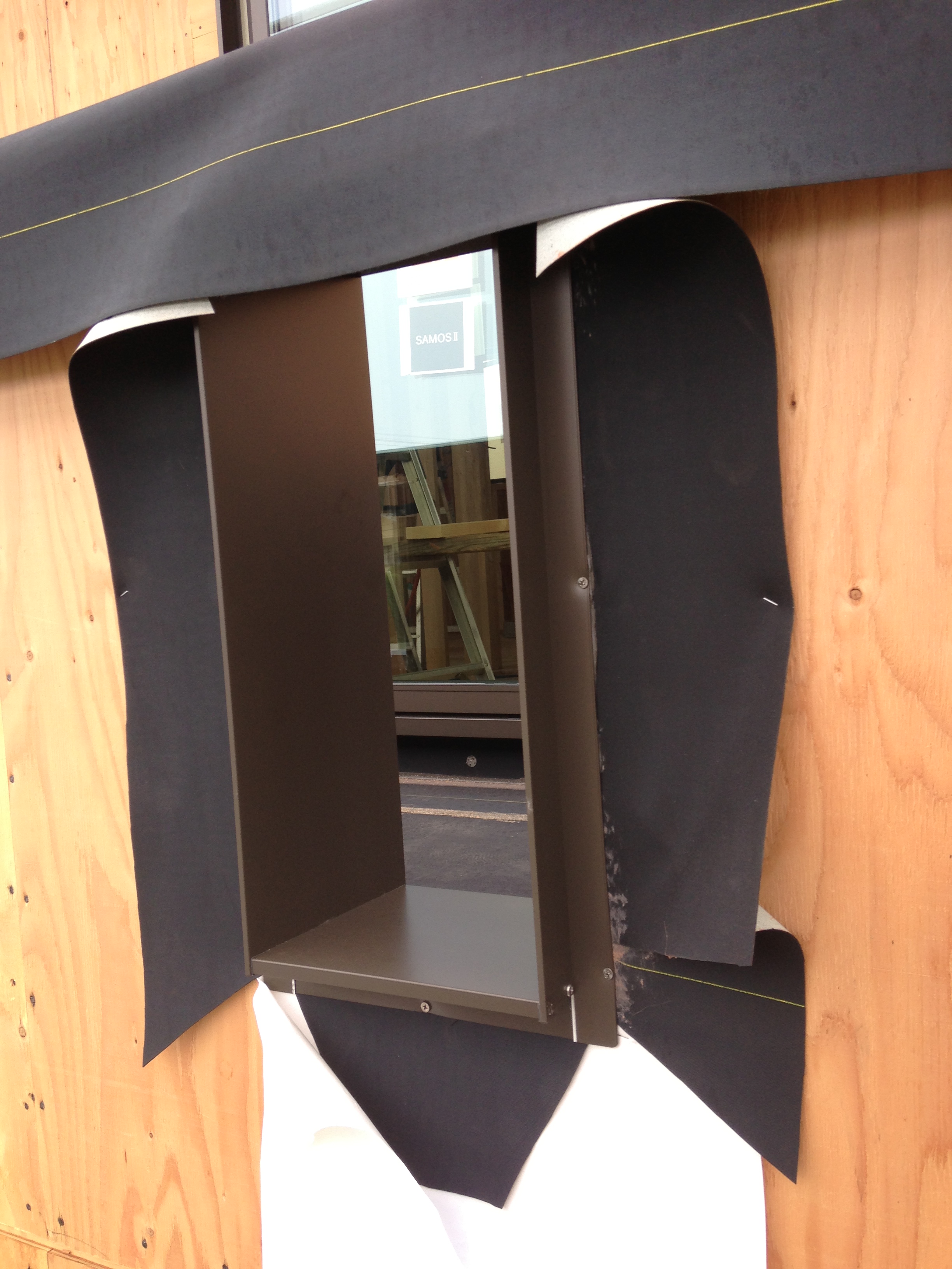 バルコニーの内側は全面に防水シートを貼った上に風穴用のサッシ部材を取付ます。