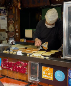 ご主人が店頭でどら焼きの皮を一枚一枚焼き上げ